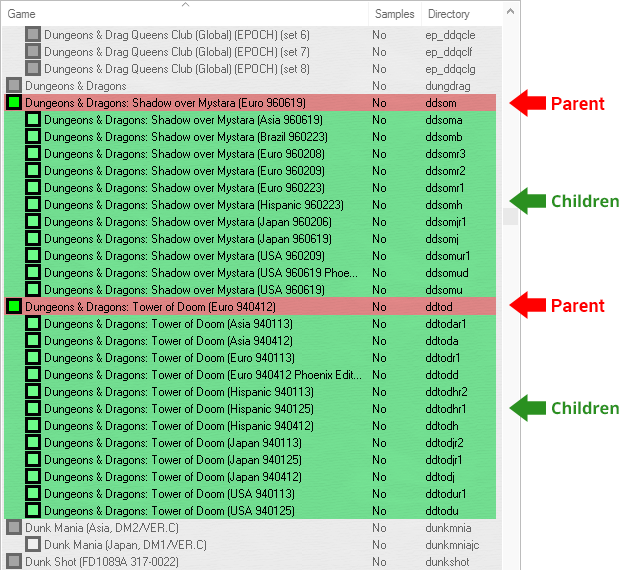 • 예: Street Fighter II' Champion Edition (Japan 920513) (부모 ROM이 필요)