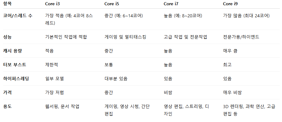 Core i7 | 제품 라인 (i3, i5, i7, i9 등) – 성능 등급 |