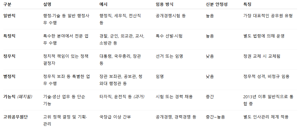 - 진로: 일반직과 특정직은 승진체계 명확, 정무·별정직은 경력 기반 이동성이 높음