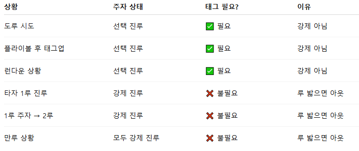 - ✅ 이유: 베이스에 서 있지 않은 주자는 포스 아웃이 적용되지 않기 때문에, 무조건 태그가 필요해요.
