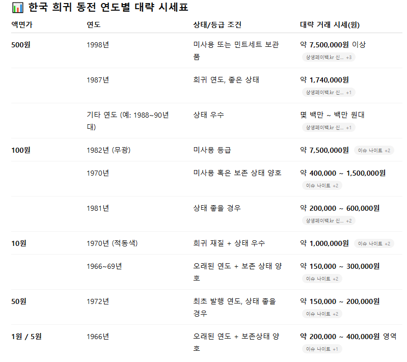 - 역사성: 특정 사건(예: IMF 시기, 화폐 개혁 등)과 연관된 동전.