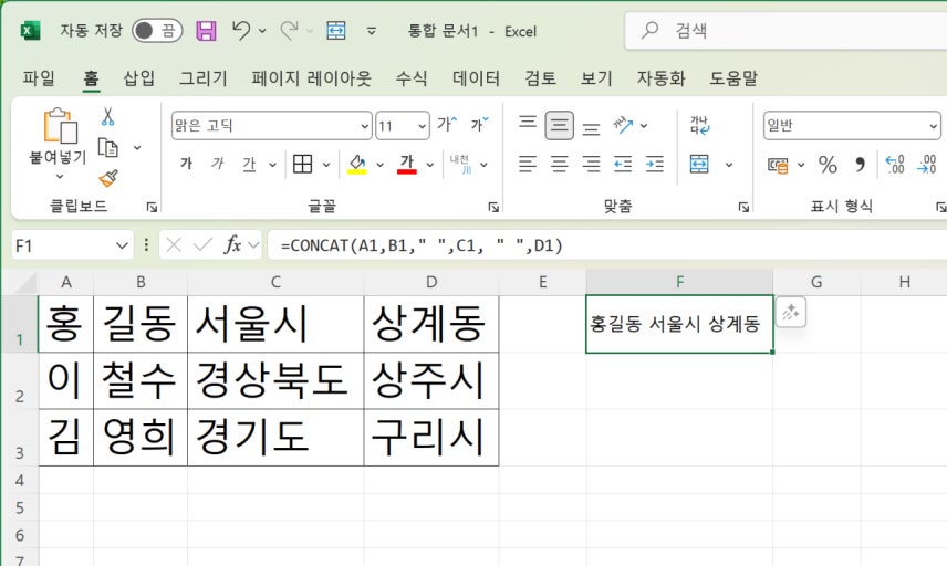 여러 셀을 자동으로 구분자 넣어 합칠 수 있어요.