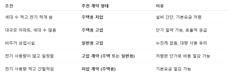 - 주택용 고압: 대형 아파트 단지, 전기요금 효율적.