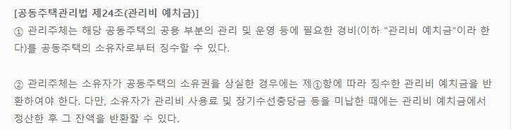 신축아파트,오피스텔 등 공동주택이 완공되어 입주가 시작되면, 처음 입주하는 사람들에게 1~2개월분의 관리비를 미리 걷는데 이것을 "선수관리비"라 합니다. 다른말로는 "관리비 예치금"이라고도 합니다. 이러한 내용은 [공동주택 관리법 제24조]에 다음과 같이 명시되어 있습니다