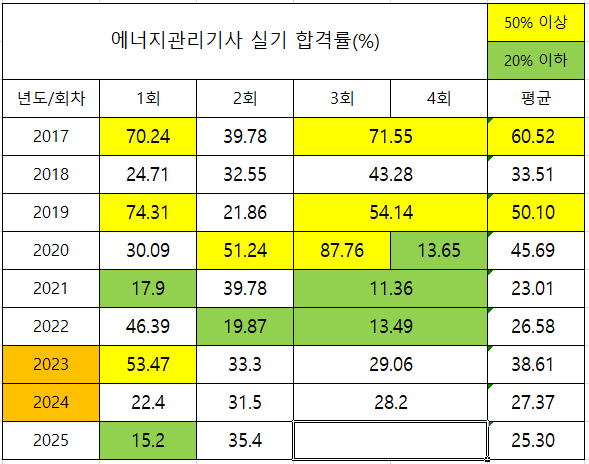 에너지관리기사 실기 회차별 합격률