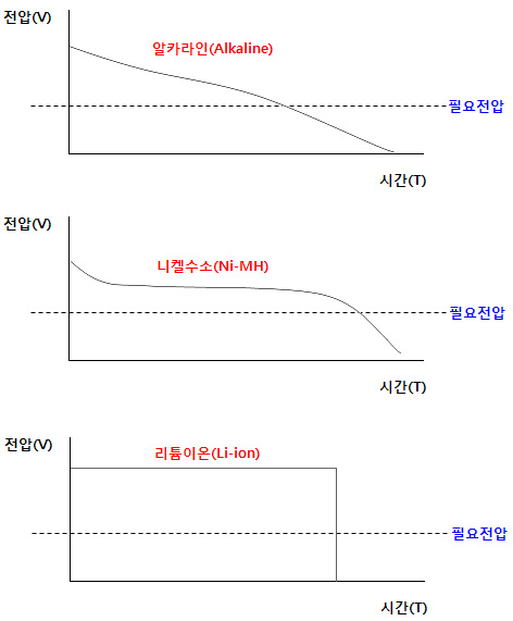 → 에너지가 소모가 많아, 배터리교체가 잦은 제품은, 충전지 사용 ※ 평균 유지 전압이 높음