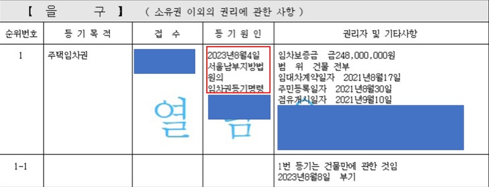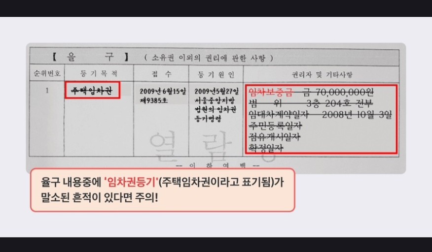 - 법원의 명령에 따라, 관할 등기소는 해당 부동산의 등기부등본에 임차권 등기를 기재합니다.
