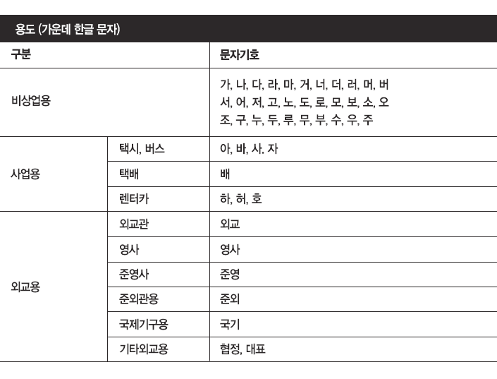 2. 1996년 1월 이후 : 차량등록지(지역) , 차종기호(숫자2자리) , 용도기호(한글) , 일련번호