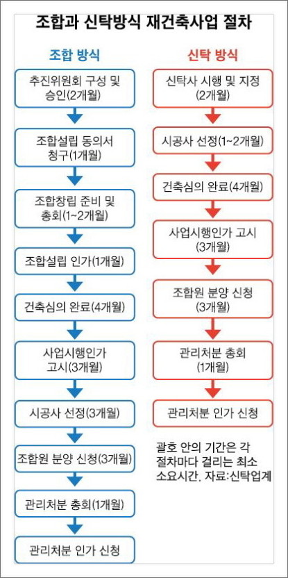 재건축 및 재개발시에 일반적으로 조합을 설립하여 추진하는데 조합의 경우 이윤을 극대화 할수 있는 장점이 있는 반면 손해에 대한 리스크가 크기 때문에 신탁 방식을 채택하는 경우도 있다.