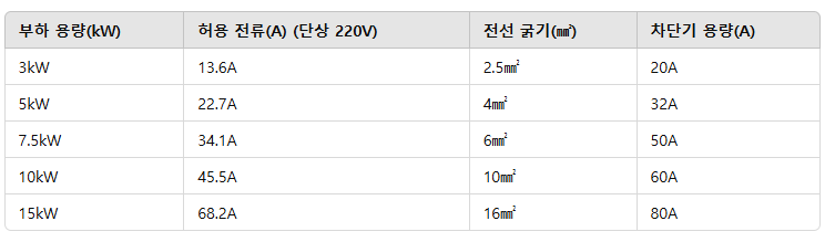 부하 용량에 따른 허용 전류, 전선 굵기, 차단기 용량 선정 방법