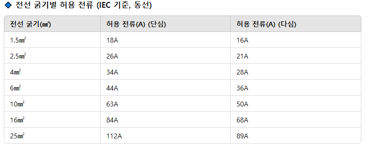 ✔ 실제 적용 시 여유 용량을 고려하여 전선을 한 단계 더 크게 선택하는 것이 안전합니다.