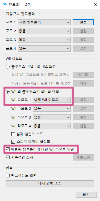 - "Wii Remote 1"을 Real Wii Remote(실제 wii 리모트)로 변경